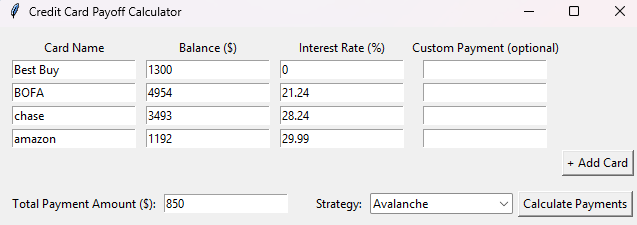 Tkinter app with Avalanche/Snowball strategies and monthly payment breakdowns.